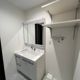 洗面台は収納力の高いタイプを採用し、生活感が出やすい空間もすっきりとした印象に。